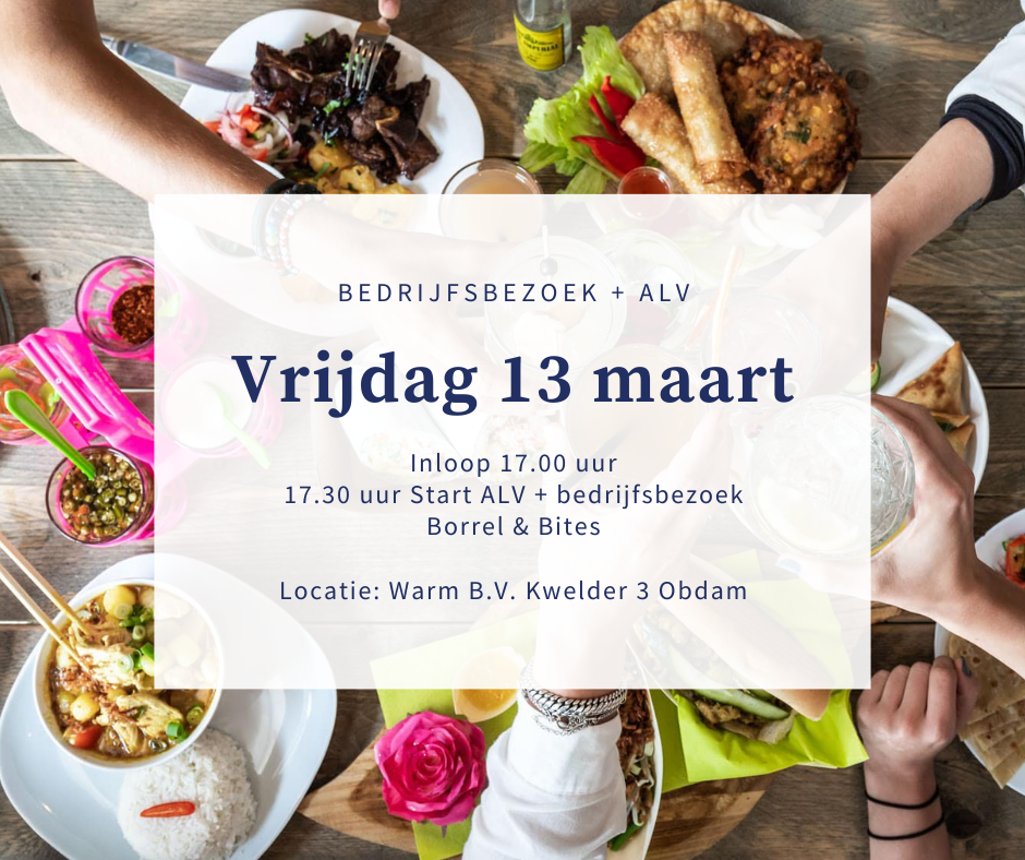 Op vrijdag 13 maart a.s. bent u van harte welkom bij Warm B.V. aan de Kwelder 3 in Obdam, inloop vanaf 17.00 uur. Wij hebben dan onze jaarlijkse ALV en krijgen een inspirerende rondleiding bij Warm B.V. Uiteraard starten we eind van de middag en wordt voor een hapje en drankje gezorgd.